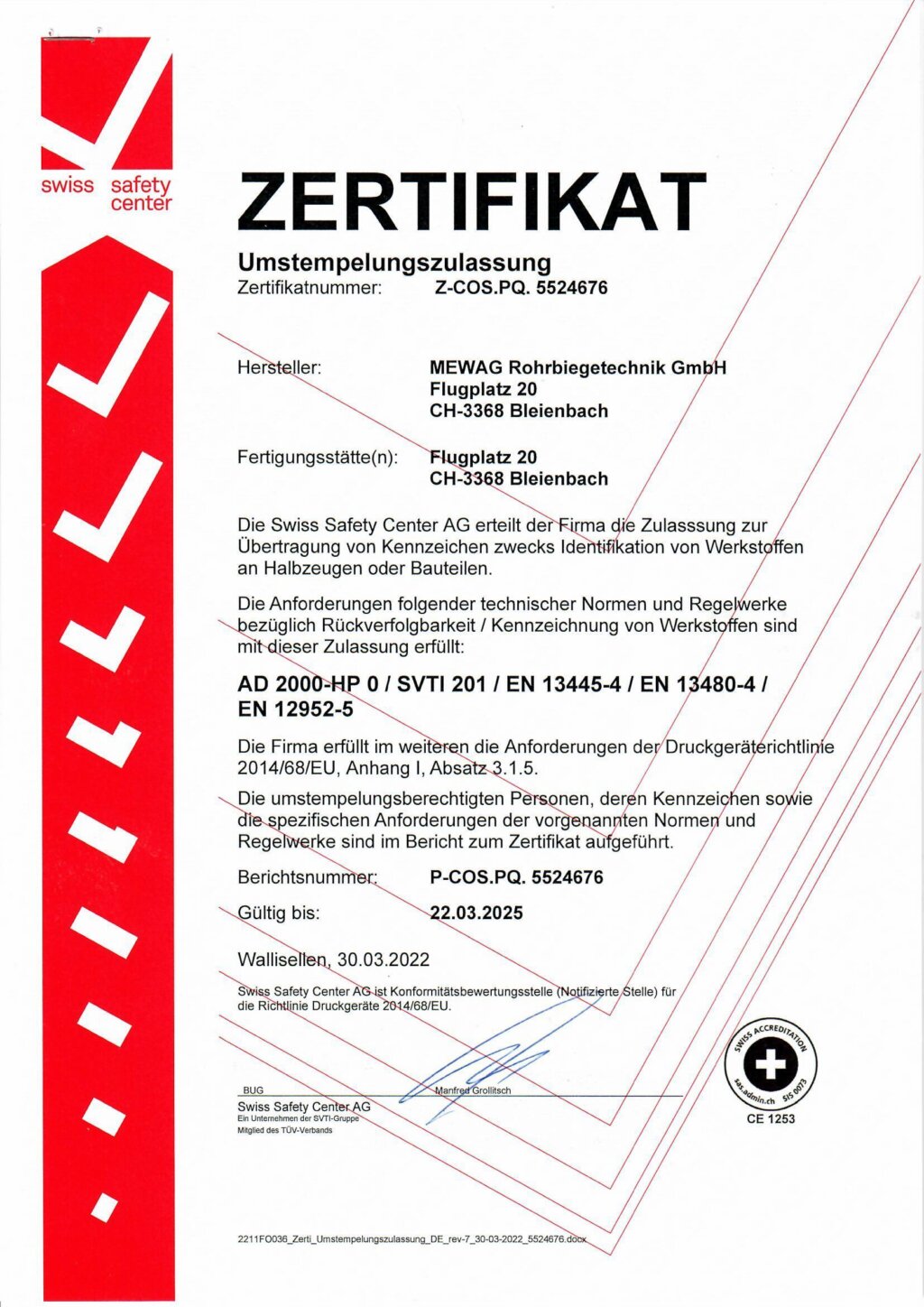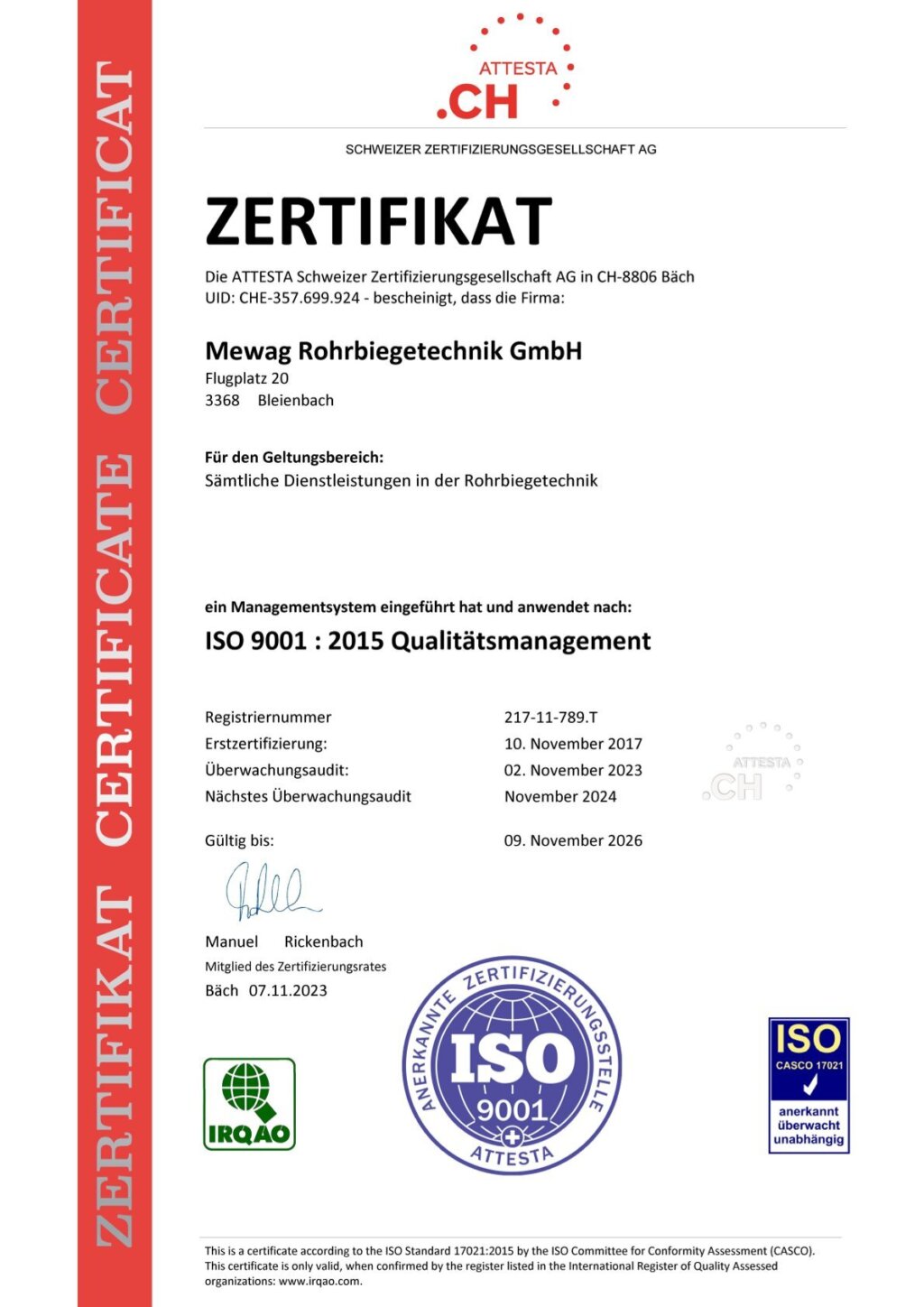 Das Qualitätsmanagement der MEWAG Rohrbiegetechnik GmbH ist nach DIN ISO 9001:2015 zertifiziert.